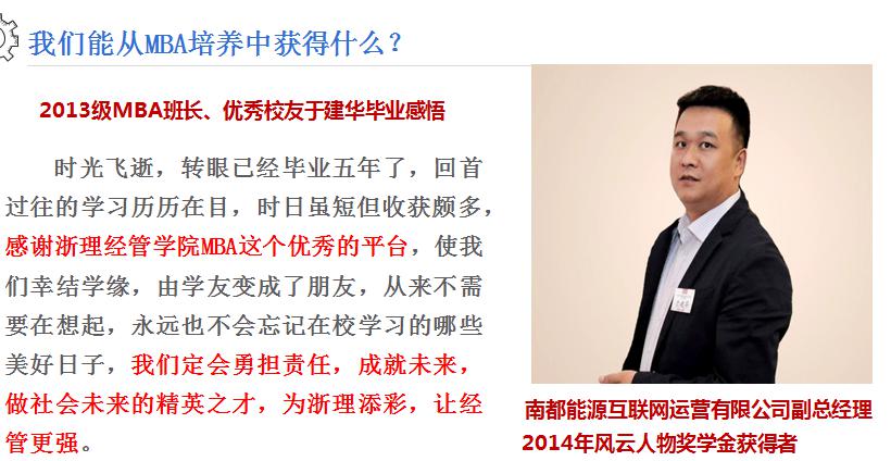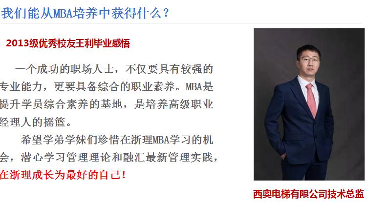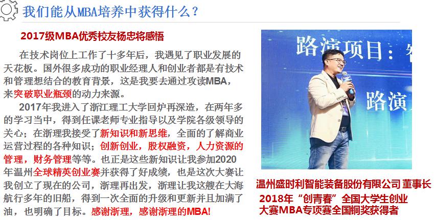 我校MBA学生培养质量得到社会的充分肯定,成绩突出。在校期间学生多人次获得“创青春”全国大学生创业大赛MBA专项赛全国奖,学生撰写的研究成果获得浙江省省长和副省长的批示,在期刊杂志上发表多篇论文。毕业后超过半数的人得到了职毕业务或职称上的晋升,近90%的人增加了薪酬,大约25%的人重新择业或创业。