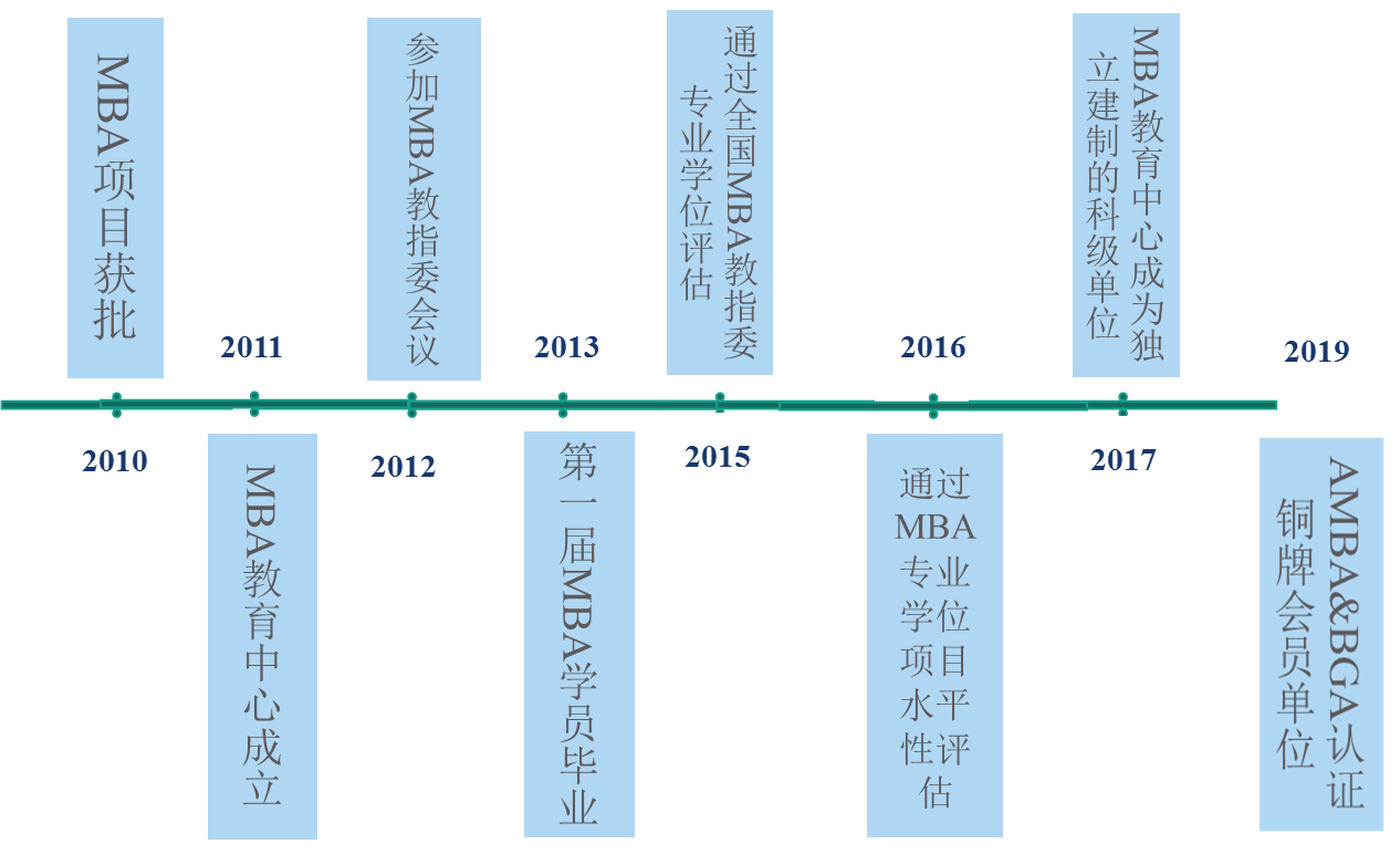工商管理硕士项目于2010年获得教育部批准设立。2011年成立MBA教育中心,2015年,2016年通过了MBA的合格评估和水平性评估,2019年成为AMBA&BGA铜牌会员单位。