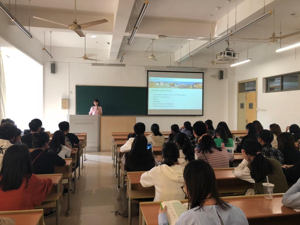 Zhao女士首先给经管学院的学生们进行了交换项目宣讲,介绍了纽约州立大学奥斯威戈分校及相关专业、学生生活、短期交换和2+2双学位项目。
