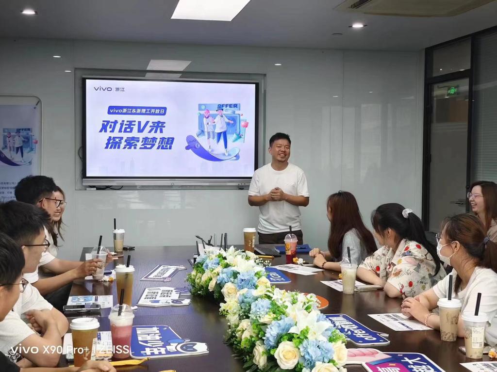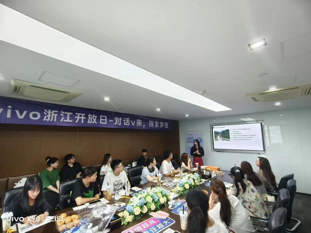 VIVO浙江通信集团有限公司坐落于美丽的杭州西溪湿地旁,周边环境优美,配套服务设施健全。同学们首先到了会议室,VIVO浙江通信集团有限公司校园培训总监张总为同学们介绍了公司的背景、各个部门的工作方向、VIVO品牌价值观、推广、品牌科技以及公司文化,其中重点介绍了杭州地区公司的对口方向。接着VIVO浙江公司廖总介绍该部门的发展情况与工作方向、研发方向及行业趋势。听完工作人员生动详实的讲解,同学们对VIVO杭州研发中心有了更进一步的了解。最后是答疑环节,同学们对想要了解的部分又进行了更细致的提问。