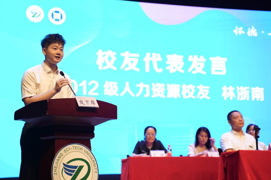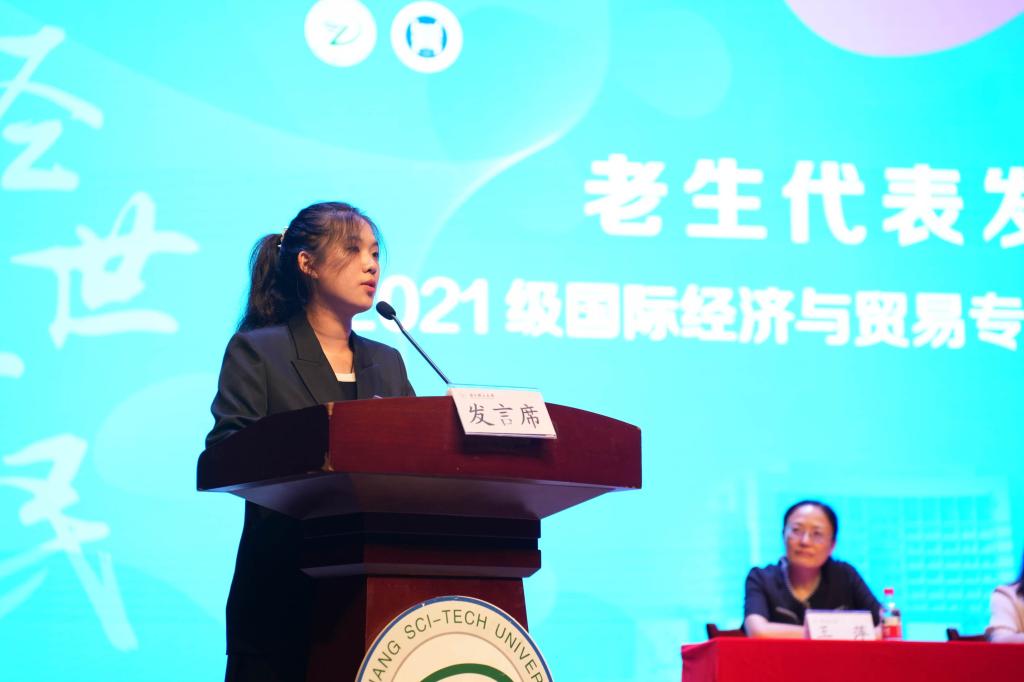 2021级国际经济与贸易专业涂成程作为高年级学生代表发言。她以“找准方向”、“进行规划”、“抓住机会”、“持续深耕”四个方面回顾大学的点点滴滴。她希望每一位新生能够保持热爱与好奇,在“浙理”寻找梦想,在“浙理”享受热烈的青春。