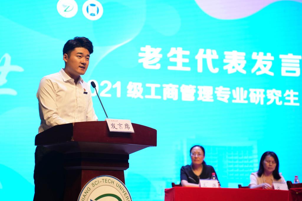2021级工商管理专业崔涵钧作为研究生代表发言。作为研究生,他告诉同学们要导师思维“共振”,在入学时就树立目标,并且勇于尝试和挑战自我,在民族复兴的伟大征程中找到自己的青春坐标,贡献自己的青春力量。
