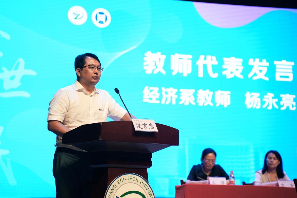经济系杨永亮老师代表全体老师欢迎2023级新生的到来,他从经济学角度阐述了选择“经管”的意义,告诉同学们要“树立理想”“独立学习”“自律坚毅”并重,把握当下,不负余生,在浙理成就最好的自己!