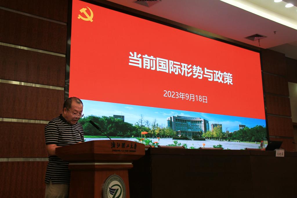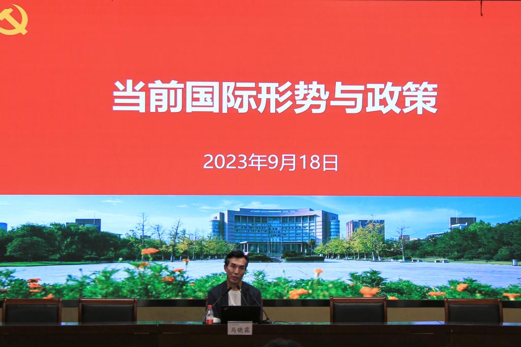 9月18日,太阳集团tyc539macau2023级新生始业教育专题讲座“当前国际形势与政策”在行政楼二楼报告厅举行,学院党委书记吕品特邀浙江外国语学院教授、环地中海研究院院长马晓霖为新生开讲,我院2023级全体新生参加讲座。本次讲座另设两个分会场进行直播观看,拓展了同学们的国际视野和战略眼光,为大家上了一堂生动的爱国主义政治课。