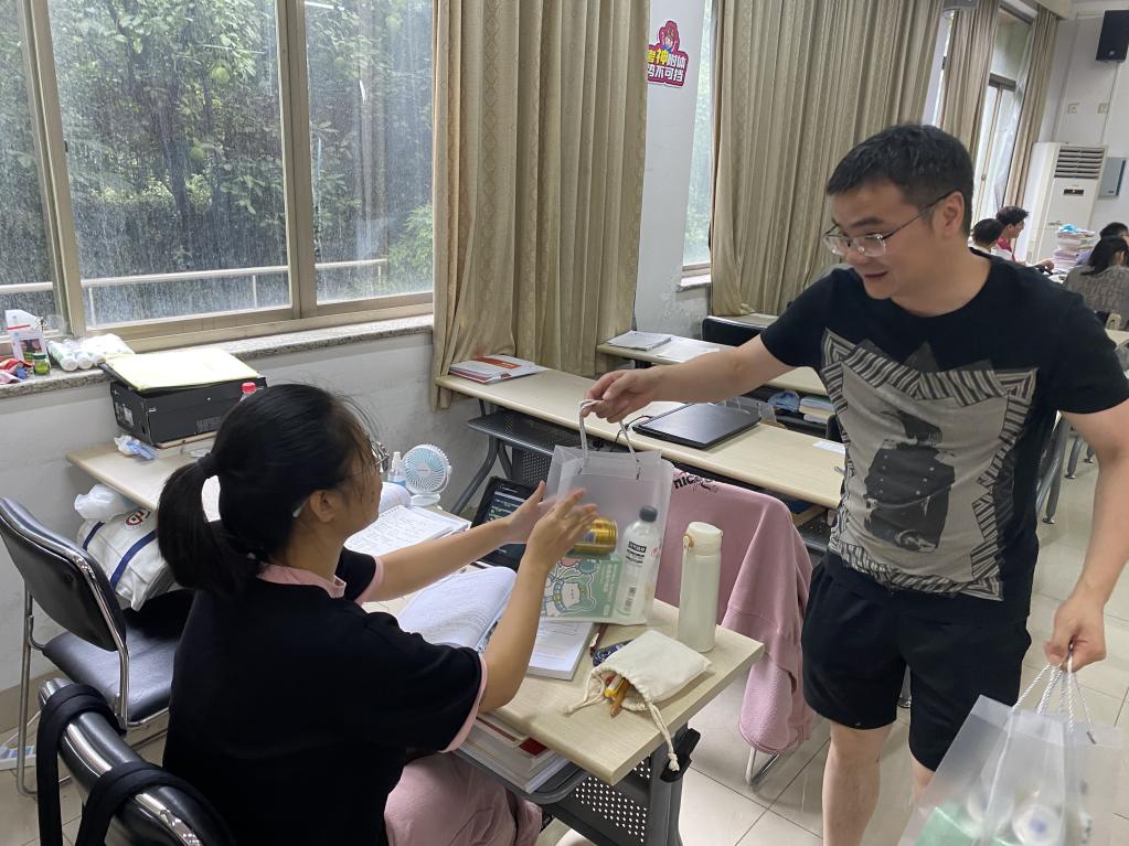 学院领导为考研学子送上温馨的考研慰问品,为枯燥的备考送上温暖,并祝福同学们一战成硕,让学生们真切感受到了来自学院的细致关怀与殷切期望。这是一份精心准备的大礼包:清凉解暑的补能饮料、舒缓疲劳的蒸汽眼罩、丰富详实的考研资料、蕴含殷切期望的驱蚊香囊,满含着对学子们深深的祝福。学生们表示一定会利用好暑假,调整状态,以更饱满的热情和信心学习。