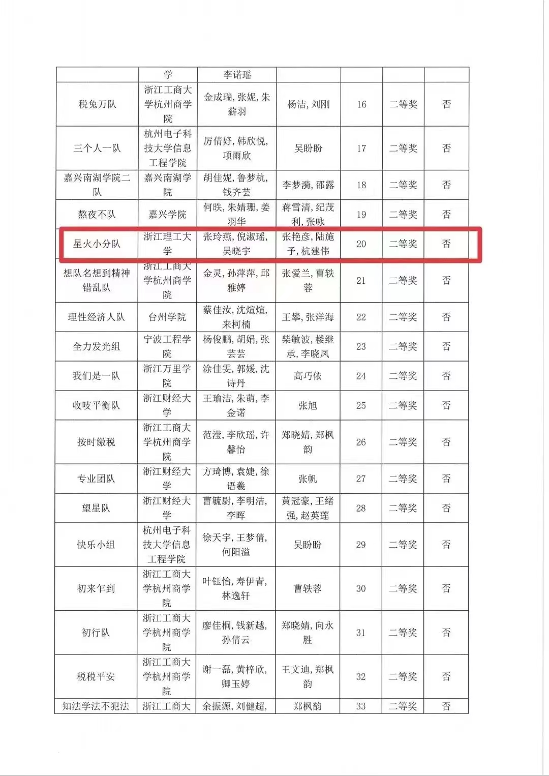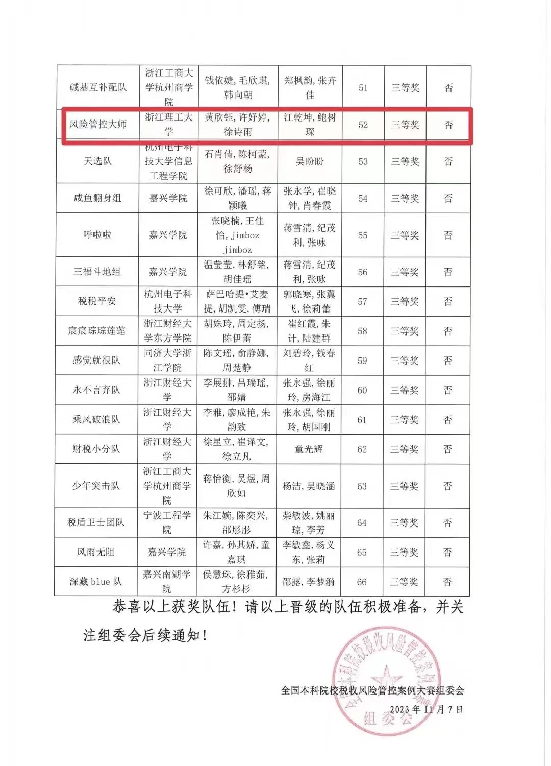 11月7日,2023年全国本科院校税收风险管控案例大赛浙江省分区赛圆满落幕,省内十余所本科院校的111支队伍,共计500余位师生参与比赛。我院共有5支队伍参赛,其中1支队伍获得一等奖、晋级国赛,2支队伍获得省赛二等奖,1支队伍获得省赛三等奖。