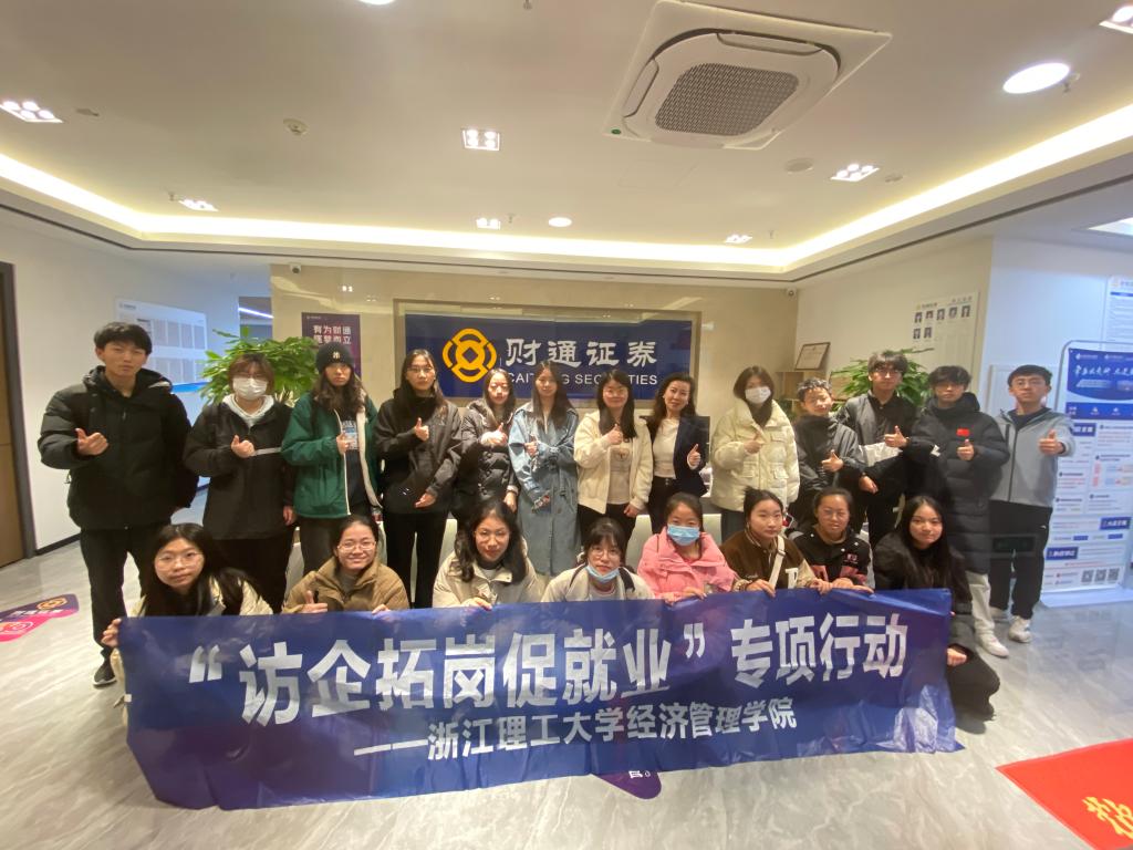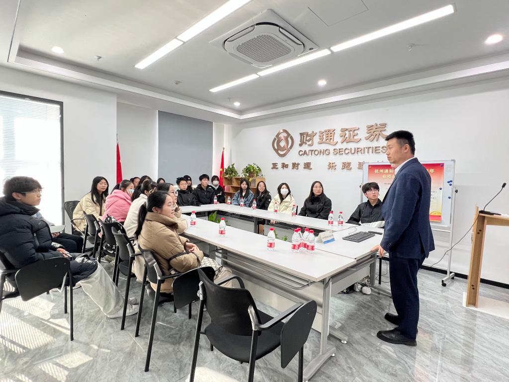 为加大“访企拓岗促就业”力度,积极拓宽学生就业渠道,开拓学生就业、实习新岗位,深化学校与企业的供需对接,2023年12月1日下午,太阳集团tyc539macau就业工作指导老师冯可带领本科生一行20人赴财通证券股份有限公司杭州通和路营业部开展“职场体验行”活动。财通证券通和路营业部总经理吴怡悦及公司骨干等热情接待了学院一行。