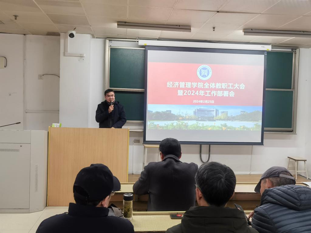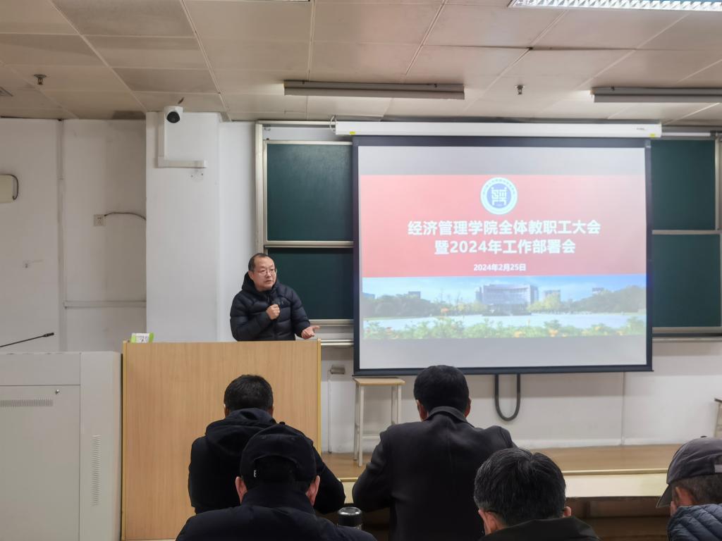 首先,潘旭伟院长回顾了2023年度学院取得的主要成绩,同时结合学院十四五规划完成情况和学校2024年工作部署会的精神提出了学院今年主要的目标任务。同时,对学院发展的短板进行了分析,指出今年要在人才引培和科研经费两个方面取得突破,希望广大教职工为学院的发展积极献计献策。