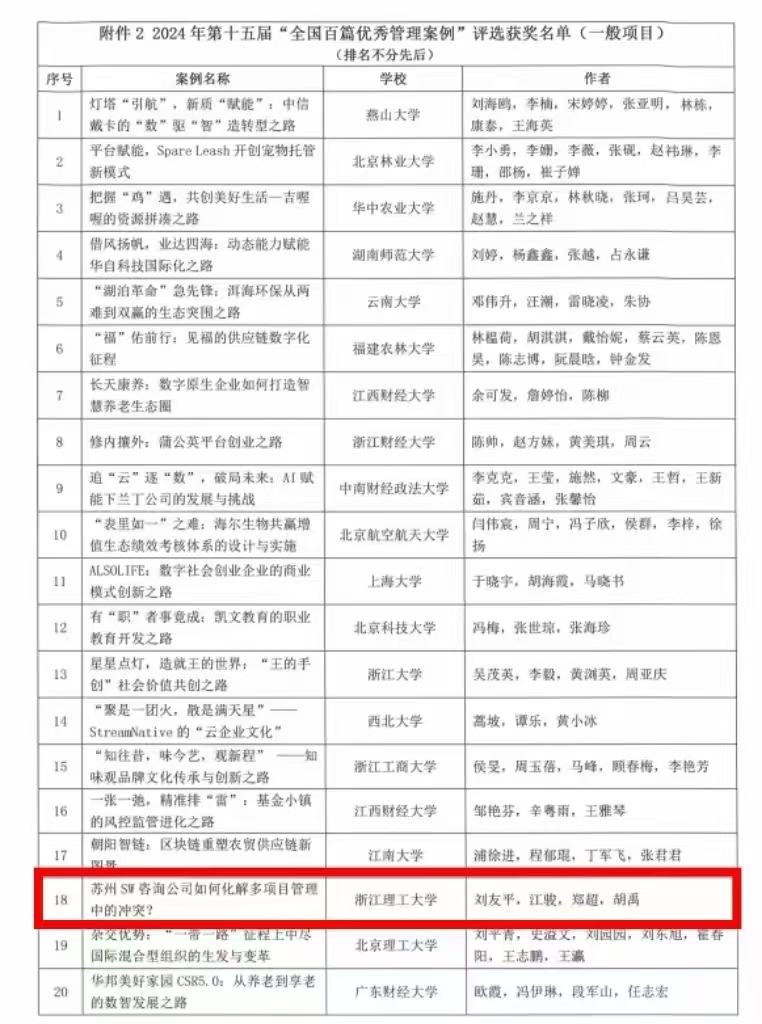 日前,中国管理案例共享中心发布了第十五届“全国百篇优秀管理案例”(以下简称“百优案例”)入选名单, 由我院刘友平老师带领团队撰写的《苏州SW咨询公司如何化解多项目管理中的冲突?》案例成功入选,这是继我院娄淑珍老师2022年获奖之后的学校第2篇全国百优案例。