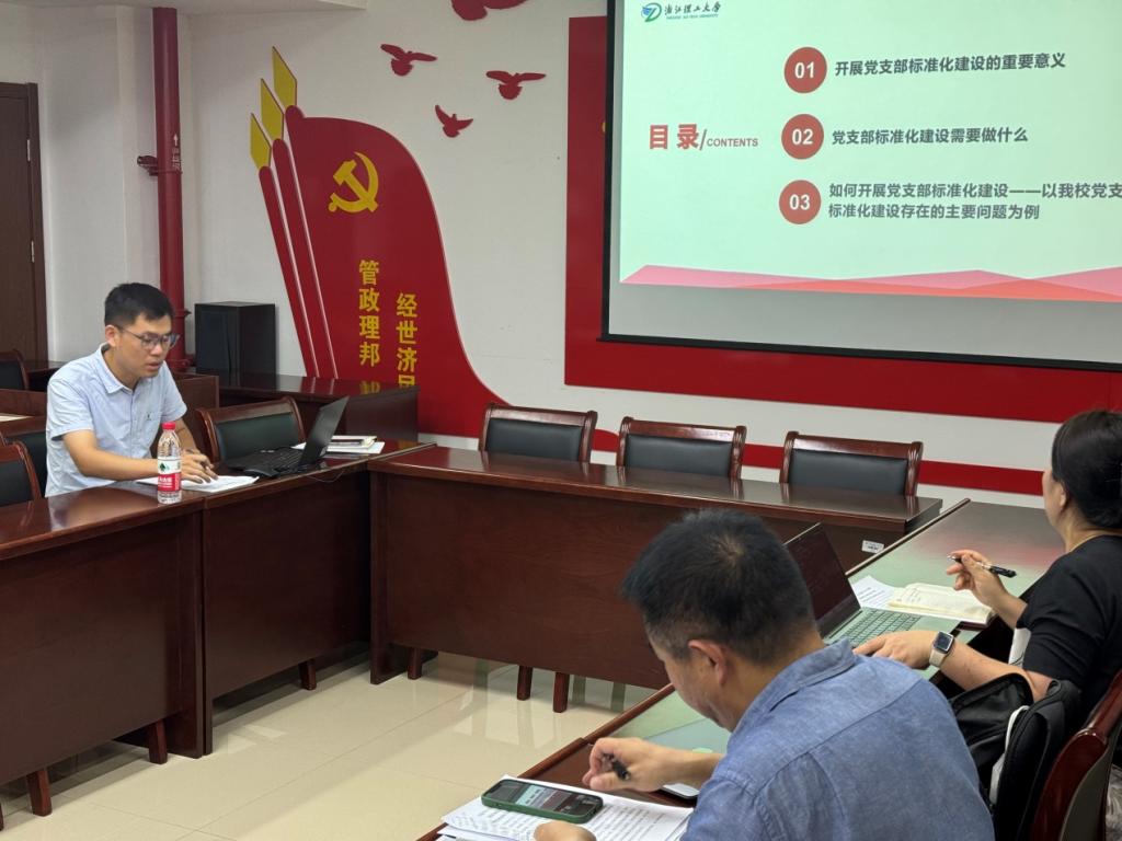 随后,学院党委邀请校党委组织部、党委统战部张维标作了党支部标准化建设专题培训。他从开展党支部标准化建设的重要意义切入,认为加强支部标准化建设是全面从严治党的内在要求,提升政治功能和组织功能的必由路径和推动事业发展的必然需要。对于如何建设的具体举措,他提出要遵循上级部门的决策部署和工作安排,并以我校党支部标准化建设存在的主要问题为例,细数操作过程中支部遇到的具体问题,结合台账范本详细讲解了填写要求和规范。