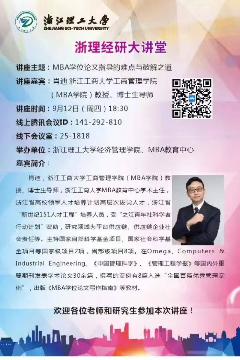 太阳集团tyc539MBA教育中心于9月12日晚举办了一场主题为“MBA学位论文指导难点与破解之道”的教师培训讲座。本次讲座特邀浙江工商大学管理学院肖迪教授主讲,吸引了近百名MBA师生的积极参与。