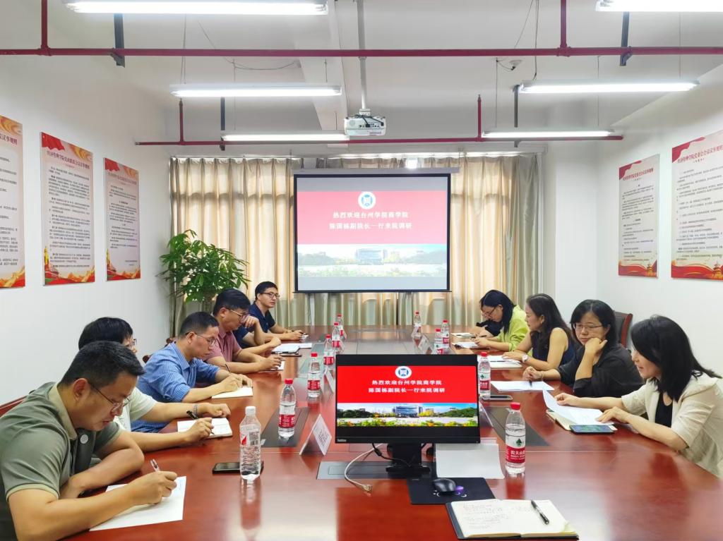 10月18日下午,台州学院商学院副院长陈国栋一行来我院调研。学院副院长黄海蓉、国际贸易系主任成蓉、工商管理系主任方齐、金融系副主任(主持工作)沈璐敏、会计系主任助理黄俊军等参加调研座谈会。会议由黄海蓉主持。