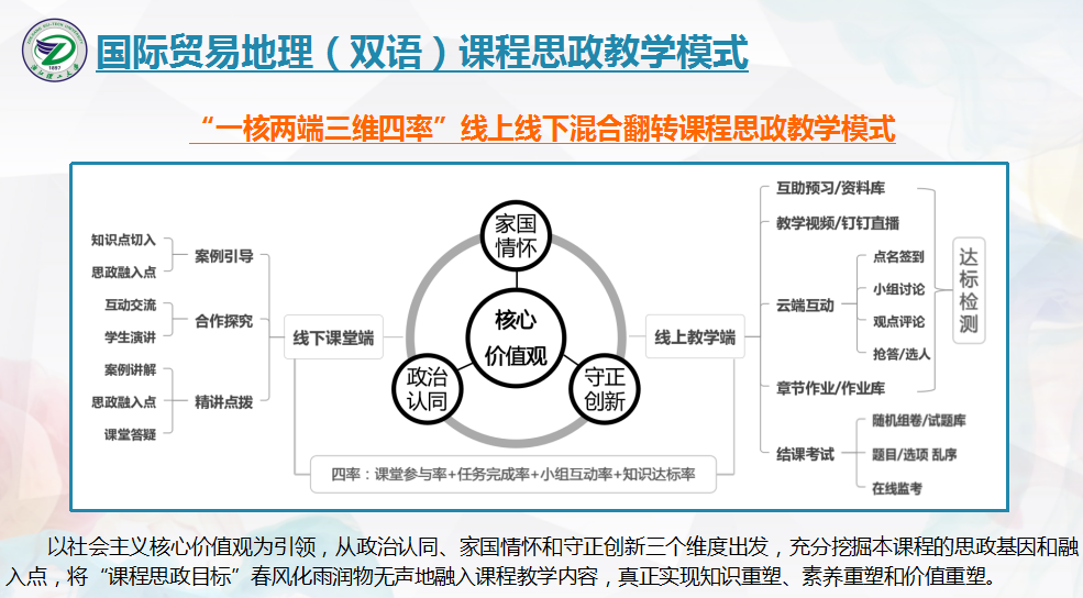 傅纯恒老师分别从课程思政认知识别、思政元素挖掘策略、课程思政教学实施、课程思政教学效果四个方面展开。他首先阐述了课程思政的定义、目标和意义,强调其在三全育人过程中的重要性,以及高校专业教师开展课程思政的使命担当和应有的行动自觉。随后,傅老师以《国际贸易地理(双语)》为例,全面介绍了教学目标确立、教学方式创新、教学内容重塑、教学模式打造等课程思政建设内容;并围绕立德树人、科学精神、家国情怀、创新精神、文化自信等多个育人角度重点诠释了课程思政元素挖掘选题的策略。