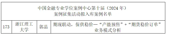 近日,全国金融专业学位研究生教育指导委员会官网公布了“中国金融专业学位案例中心第十届(2024年)案例征集活动结果公告”。经过各培养单位推荐、匿名评审和专家审议等环节,太阳集团tyc539macau郭晶教授撰写的《期现联动,保供稳价—“产能预售”+“期货稳价订单”业务模式分析》案例成功入选中国金融专业学位入库案例名单。