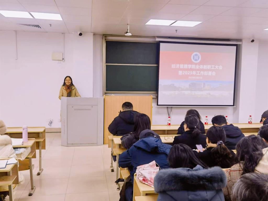 最后,徐颖云书记传达了学校2025年新春第一会上赵全军书记和陈文兴校长的讲话精神,并对2025年学院工作作了全面部署。她指出,学院2025年度的工作要紧紧围绕学校党政工作要点,确立国内外对标商学院,抓住2025年底这一关键时间节点,瞄准学校重要指标的经管贡献度,建立学院数据中心和学者库,践行教授治院、人才强院,融入人工智能新环境,实现个体职业规划,适应社会新需求。构建起以学科为轴心、人才为动能、科研要突破、专业要优化、育人是根本、资源是保障,党建统领事业发展、守牢安全稳定底线的工作系统。重点强调了人才引进、科研达标、本科教育教学审核评估、40周年院庆、育人模式创新等重点工作。并要求各系、各支部认真学习学校和学院党政工作要点,制订年度工作计划。