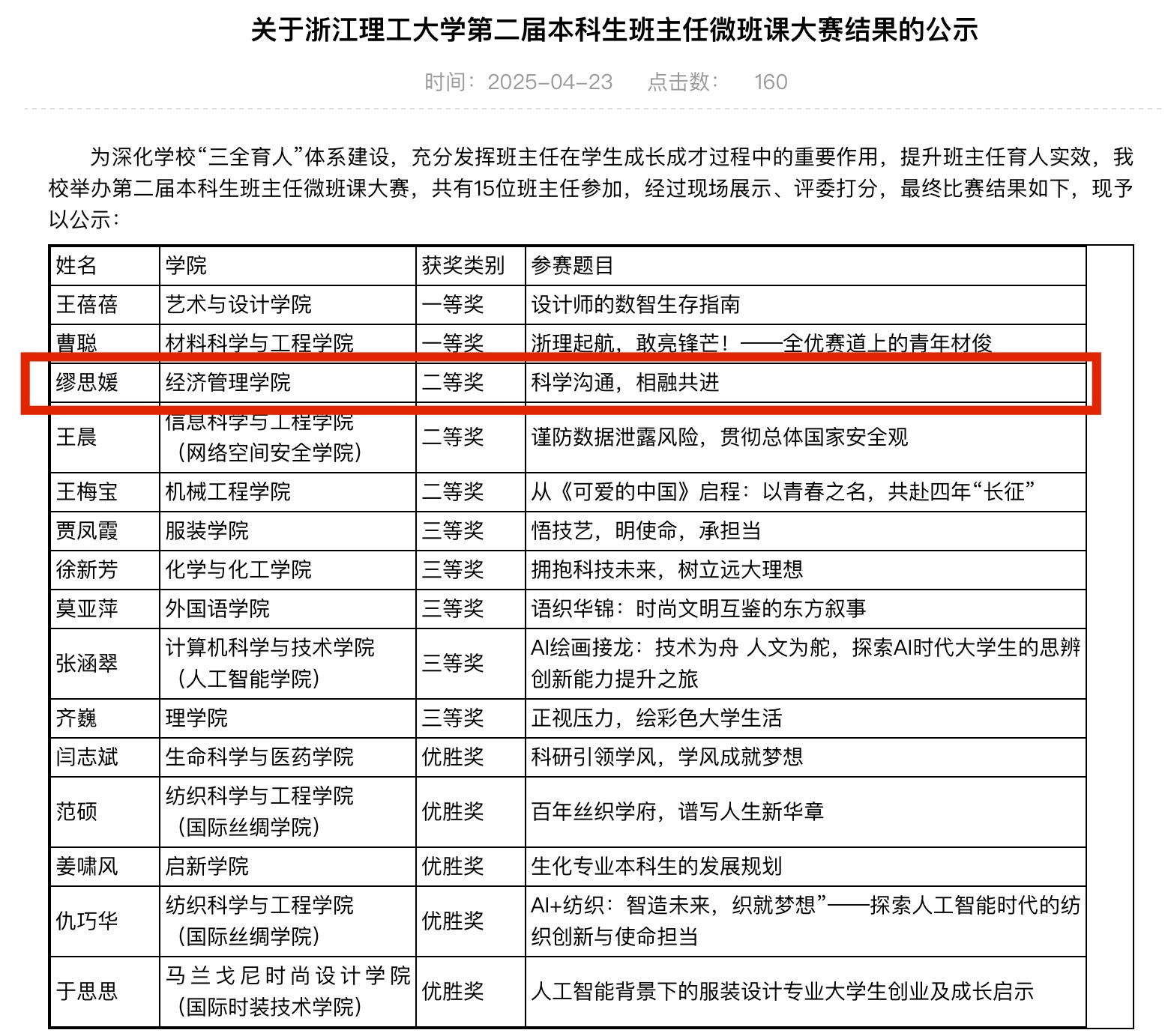 为深入学习贯彻落实习近平新时代中国特色社会主义思想,落实立德树人根本任务,充分发挥班主任在学生成长成才过程中的重要作用,我校于4月23日下午举办第二届本科生班主任微班课大赛决赛。经学院推荐和校级复赛评审,我院工商管理系教师、2024级工商管理全英班班主任缪思媛老师入围决赛,并在15位参赛选手中脱颖而出,荣获大赛二等奖!