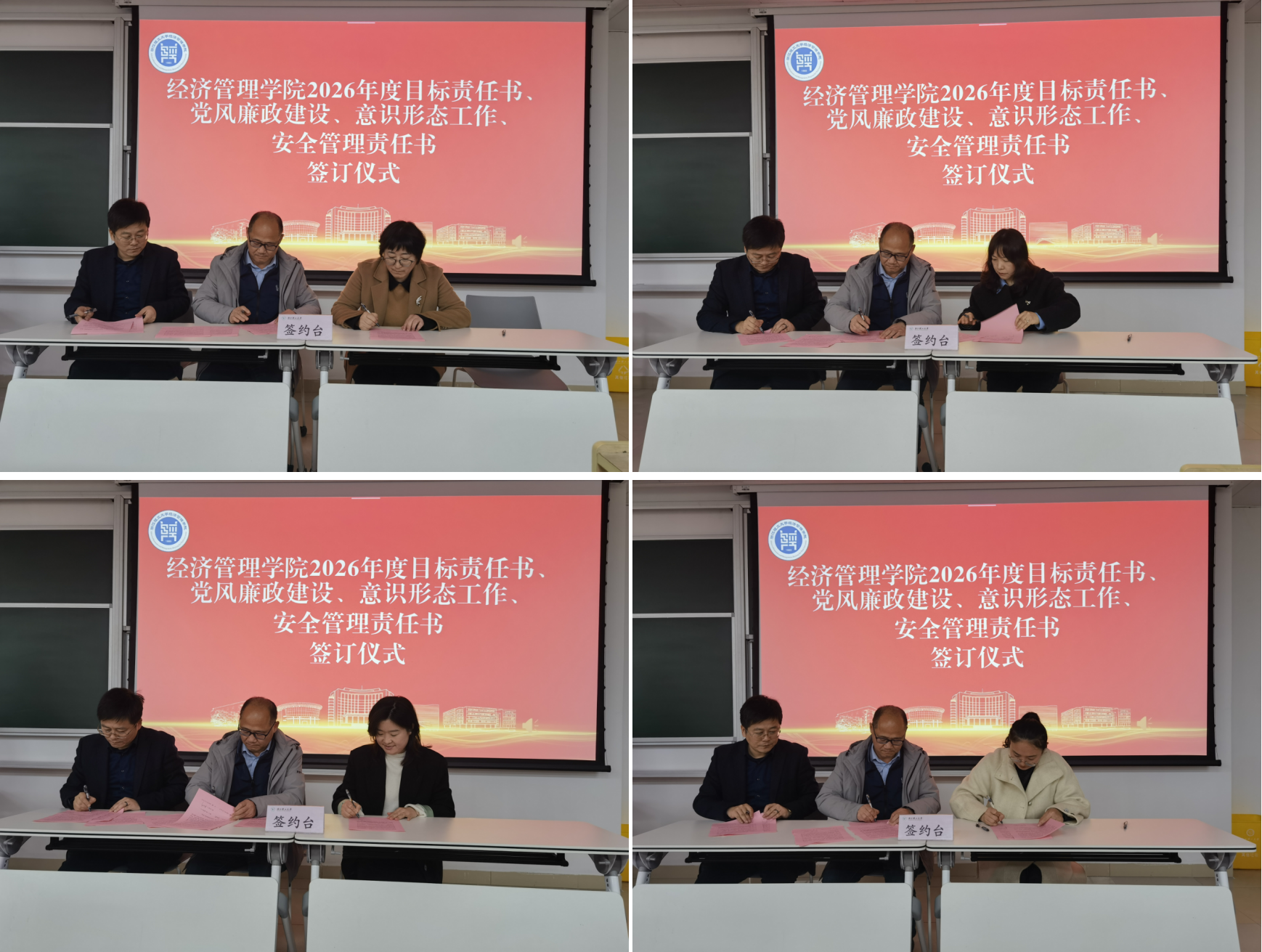 会上举行了2026年度学院内设机构目标责任书、党风廉政建设责任书、安全管理责任书、专项工作责任书签订仪式。学院党委书记彭学兵、院长杨翼与各系、中心、办公室负责人分别签订责任书,进一步明确年度工作目标和责任要求。