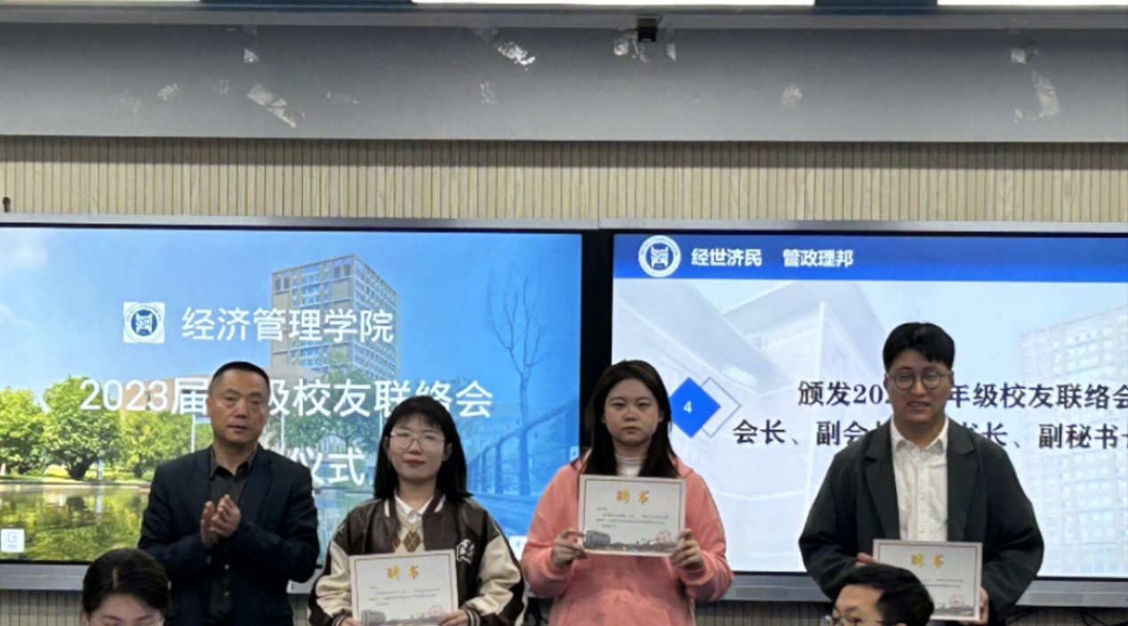 经各年级、专业推荐,学院校友联络办公室审核,大会审议并通过了2023届年级校友联络会理事建议名单年级校友联络会会长、副会长、秘书长、副秘书长建议名单,并由学院党委副书记李孝明为他们颁发聘书。