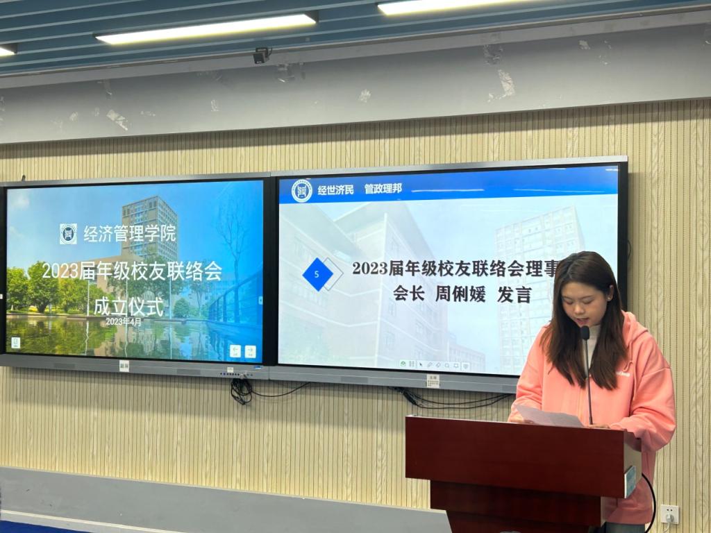 2019级工商管理(全英文)专业, 2017级国际经济与贸易专业、2023届年级校友联络会会长周俐媛发言。他代表2023届年级校友联络会向母校和学院表达了衷心的祝福和感谢,分享了在理工求学的经历和感悟。同时也表示将尽己所能,构建起校友与学院间联系的新桥梁,为紧密校友与校友间、校友与学院间关系,创造出坚实的平台。